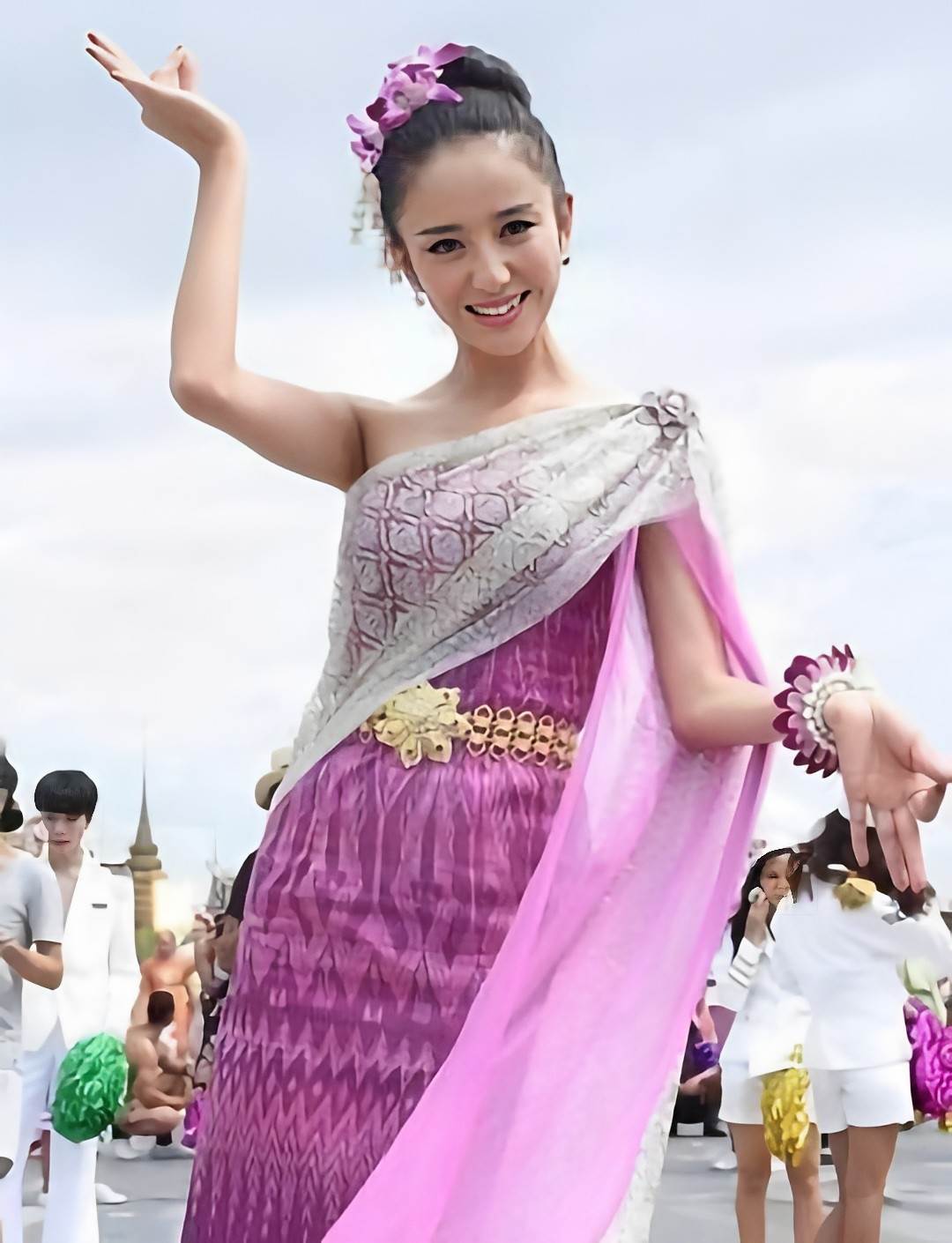 新疆美女佟麗婭同樣也穿過傣族的服裝,妥妥的古典美女一枚,身著紫色的斜露肩開叉裙的她,把性感的香肩和大長腿展現得淋漓盡致,再加上金色花朵的陪襯,簡直美得讓人難以移目。