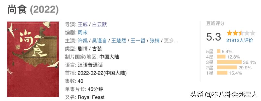 再加上劇情老套、拍攝手法混亂,妝造一言難盡,明明女演員都是美女,在劇里卻被霍霍成「老姑婆」,毫無美感。最后《尚食》成績不及格,也在意料之中。