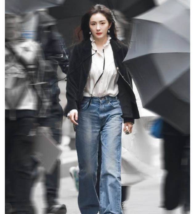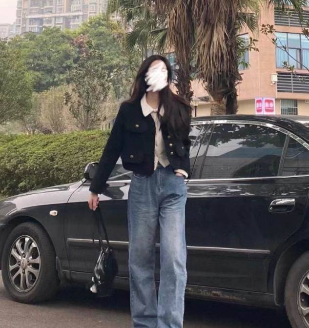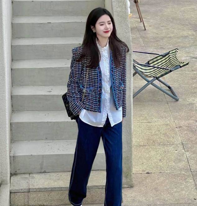 休閑游玩的造型當然可以展示出你更多的個性氣質,參考楊冪的這一套穿搭,用黑色的小香外套組合藍色闊腿褲,擁有一種深淺配色的對比感,而牛仔直筒褲選擇褲型設計,也更有一種少女感的風格。