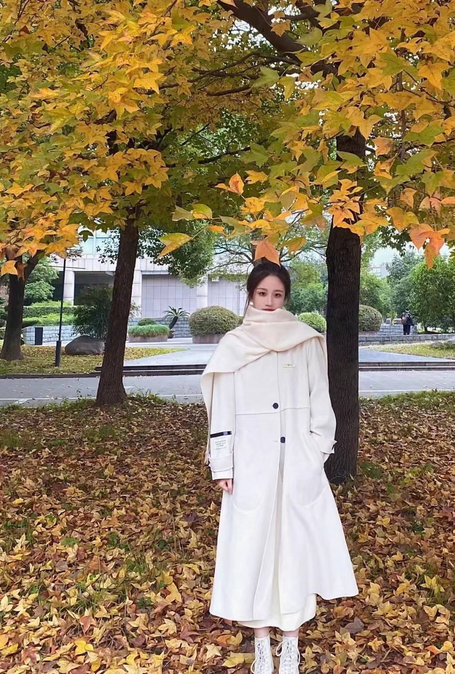 除此之外,白色圍巾也如同黑色圍巾一樣,具有百搭屬性。但為了幫助大家把白色圍巾戴得更出彩,我建議采用同色配色法,比如下圖中的穿搭造型,既將白色簡約清爽魅力展現得淋漓盡致,也讓人彰顯出女神般的氣質。