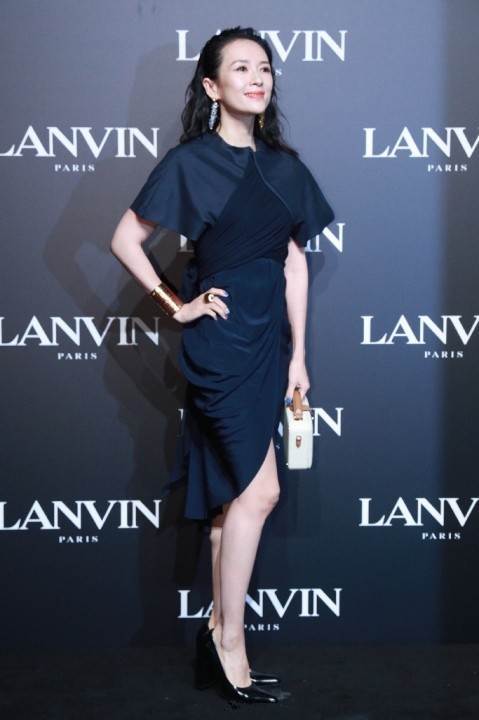 一般女星在出席活動時,總是喜歡穿靚麗高飽和的顏色,希望能通過穿搭來增添存在感,而章子怡卻反其道而行之,挑選了一襲藏青色為主調的連衣裙。但這種深色的連衣裙也更襯膚色,衣領和裙擺采用了不同的色系,這種撞色也讓裙子多了幾分設計感,深色處理褶皺的面料,十分顯瘦,也起到了收腰的效果。