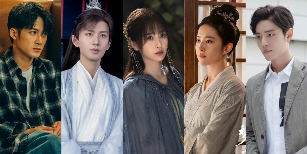 檀健次(左圖起)、成毅、虞書欣、劉亦菲及肖戰今年都因作品創造高話題,粉絲數持續攀升。(取自微博)