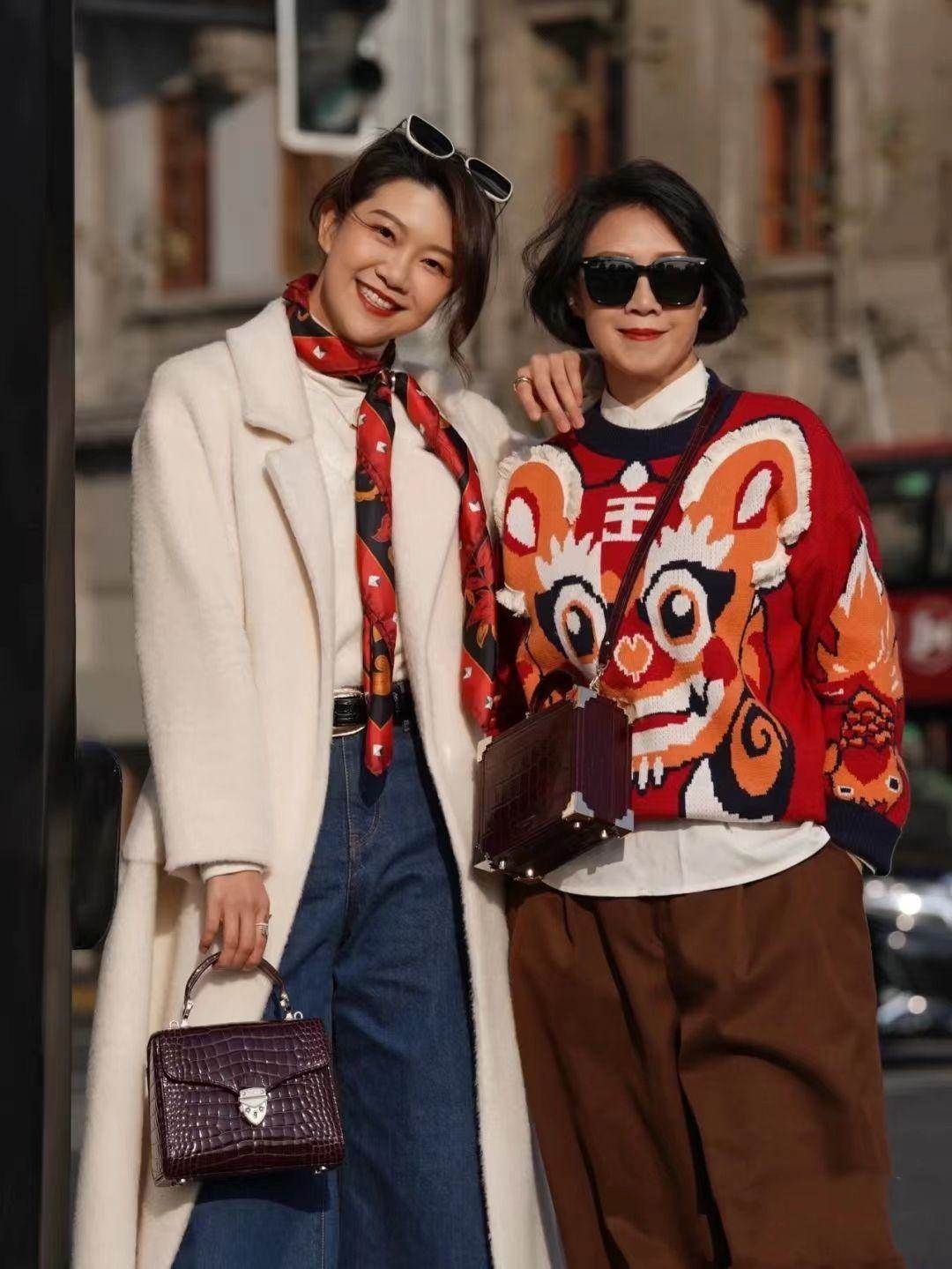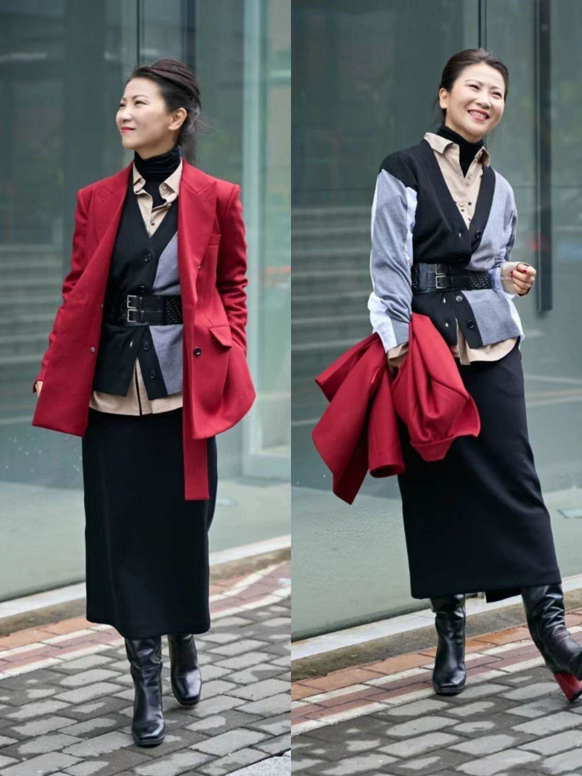 一般推薦大家選擇色彩對比比較鮮明的里外單品,或者顏色相近但存在變化的配色思路,比如藍白、黑白,或者學梅梅道來用棕色搭配紅色。