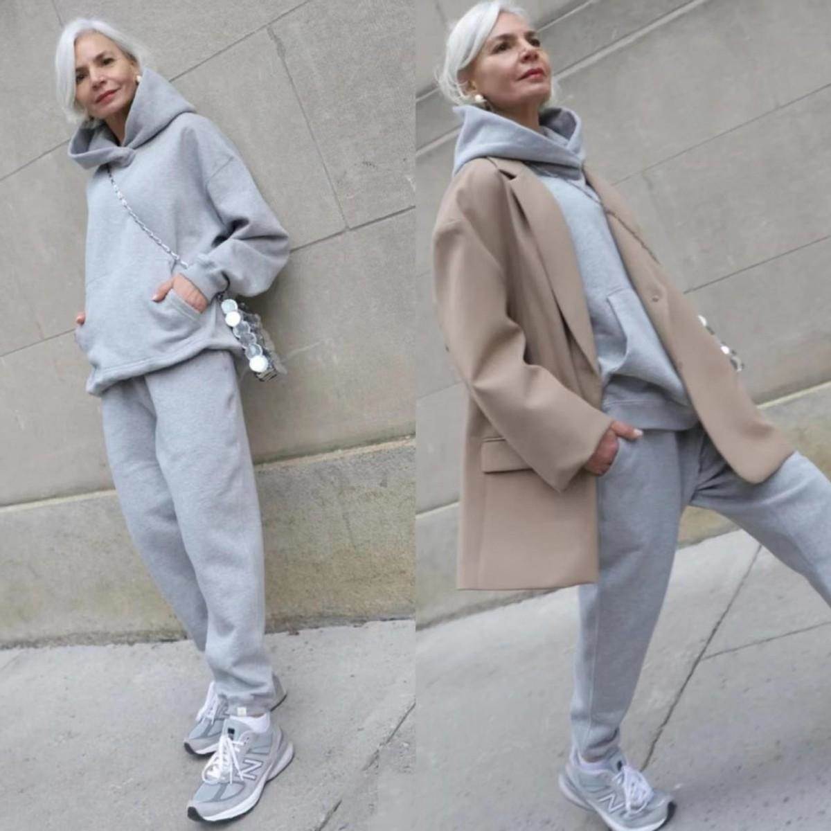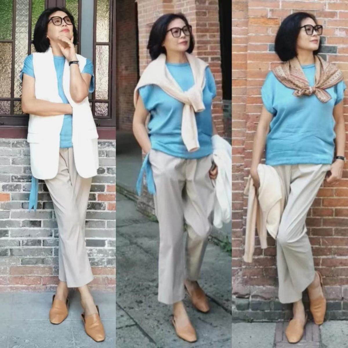 那些靠穿老了也很時髦的媽媽輩們,都熟稔運用疊穿技巧,到了秋天,衣服基本都疊著穿。比如用馬甲疊穿彩色衫,用針織坎肩疊穿襯衫,用西服、風衣疊穿打底衫、衛衣等等。再不濟也會將圍巾、披肩安排起來。60+博主后街白娘子就是很好的例子。