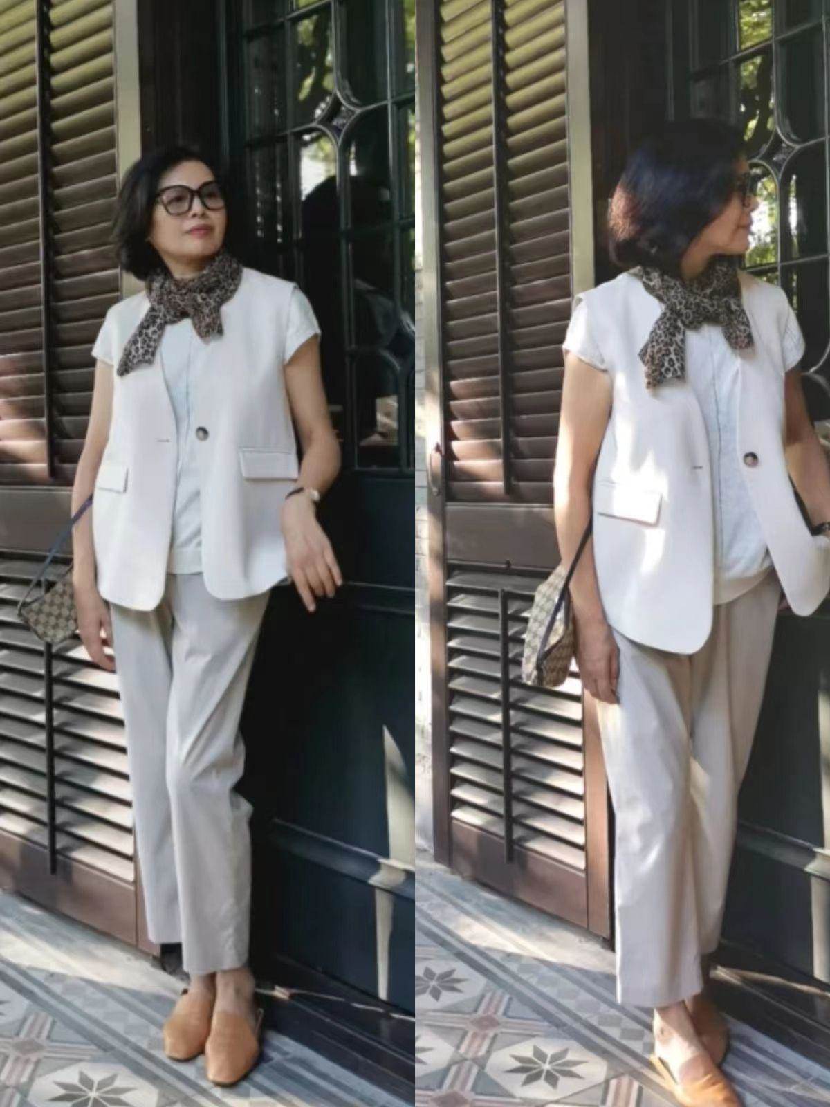 對于上了年紀的女人,推薦采用類似藍白、米色+米色等柔和大方的配色思路,穿出溫婉氣質。