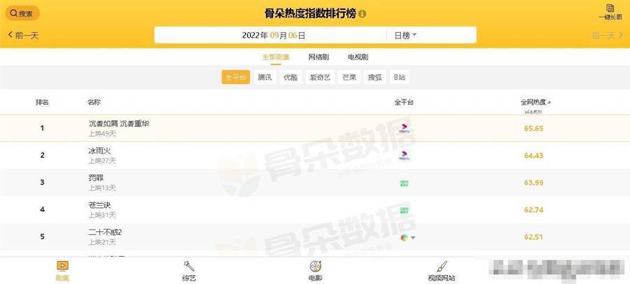 電視劇全網熱度榜Top5:《罰罪》跌至第三,第一熱度指數65.65
