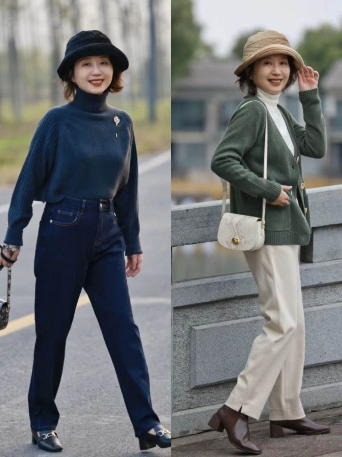 這些經典大氣的顏色結合平頭、粗跟設計,能夠輕松塑造優雅穩當又有力量感的中年女性形象。實際搭配時,我們還可以借鑒羊小愛不萌和洪小鵬,統一包包、靴子顏色!