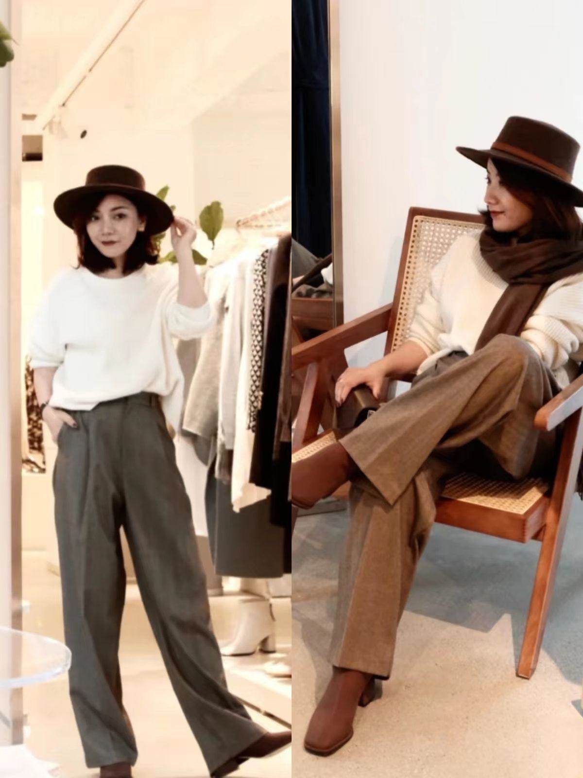 瀟灑大氣的高腰闊腿西褲,與粗跟平頭短靴也很般配,保暖舒適又大方。
