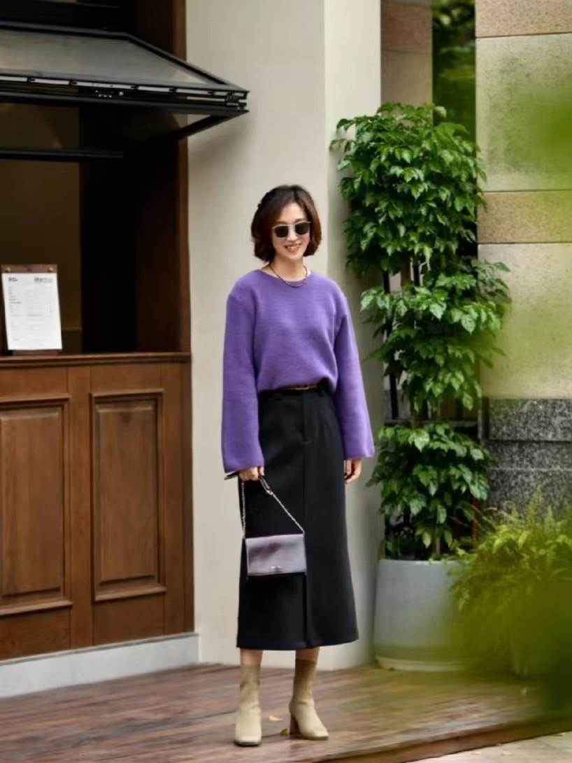 短靴配長裙,初冬最不易出錯的搭法之一,優雅又得體。人到中年,買長裙要適齡,還要考慮身材,像身材窈窕的中年女人,可以選擇A版型、直筒版型毛呢長裙、西裝長裙。