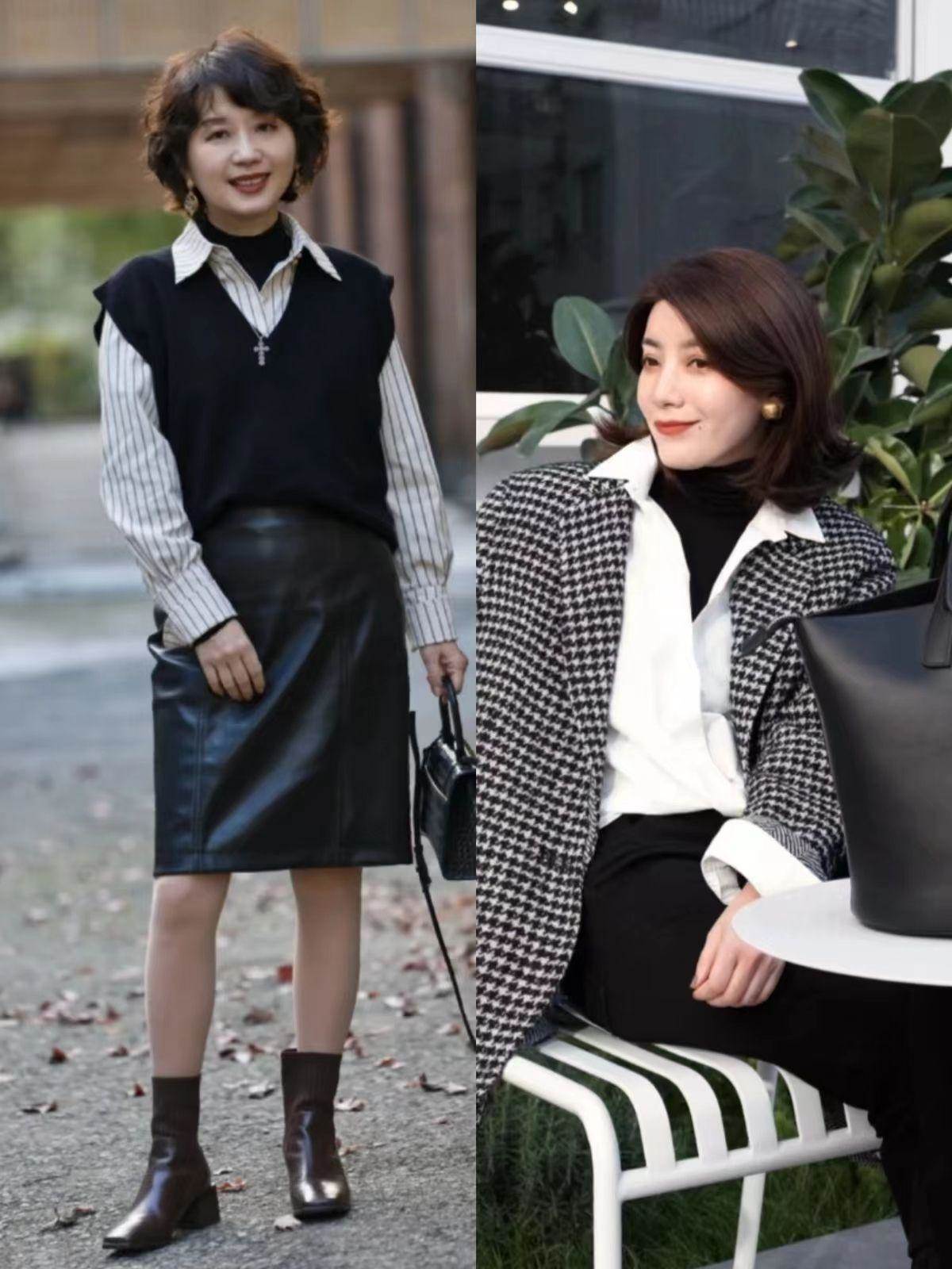 裙裝與短靴的搭配時尚優雅、難以過時,是初冬出街的正確打開方式。對于中年媽媽,建議你選擇一條長度在膝蓋附近的黑色及膝皮裙,皮革裙裝適合初冬不說,組合平頭粗跟短靴,還能碰撞出不一樣的時尚火花。