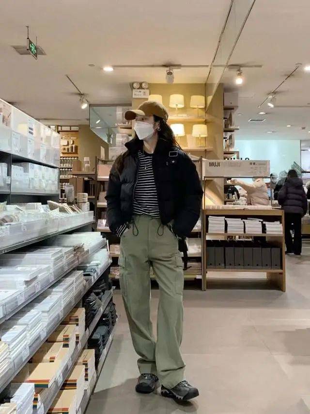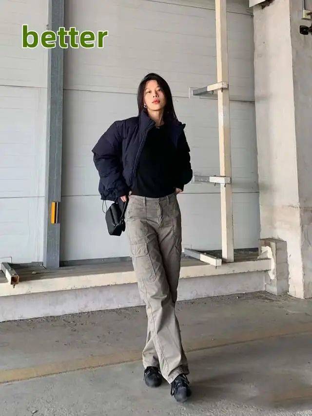 還有一點需要注意的是,棉服的色彩最好不要太夸張,配合工裝褲的中性感,選擇黑色的更加帥氣也更加顯瘦,黑色是緊縮色,能夠削弱羽絨面料的膨脹感。