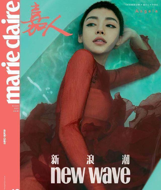 封面一angelababy穿著紅色紗質連衣裙,躺在浴缸中,迷離的大眼睛尤其突出。