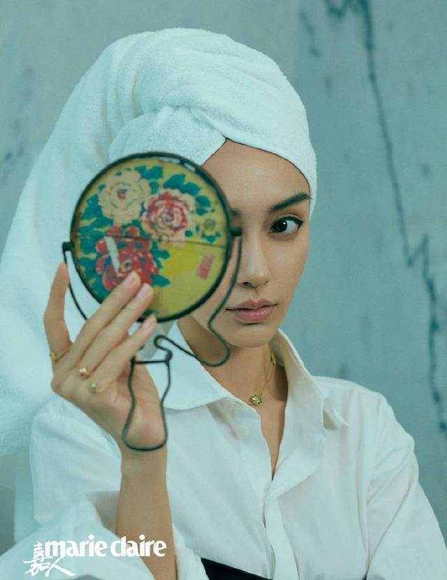 封面二angelababy穿著黑色抹胸,金色耳環、金色項鏈、金色手鐲實在是點睛之筆,她淡定地靠坐在沙發上,理發師在一旁給她剪頭髮,淡定從容,氣場滿分。