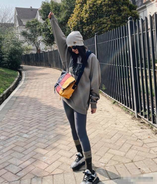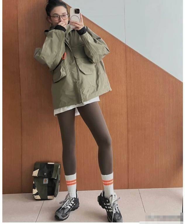 骨架寬大的女生身材并不掛肉,但是骨骼感很明顯,所以穿搭長款外套可以優化整體縱向的比例。穿搭瑜伽褲可以銜接長襪,做好深色系瑜伽褲和淺色鞋子的顏色過渡,只露出小腿的穿法,也特別時尚。