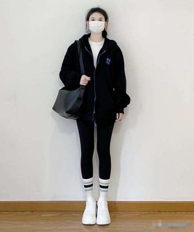 對于身材細節的把握,無非就是修飾偏胖的部位展示,顯瘦的部位,大腿偏粗的問題其實并不難去除,加長上衣的選擇,既可以設計下衣失蹤的即視感,遮擋大腿部分不顯胖。也可以和運動鞋呼應,形成色彩的對稱感。