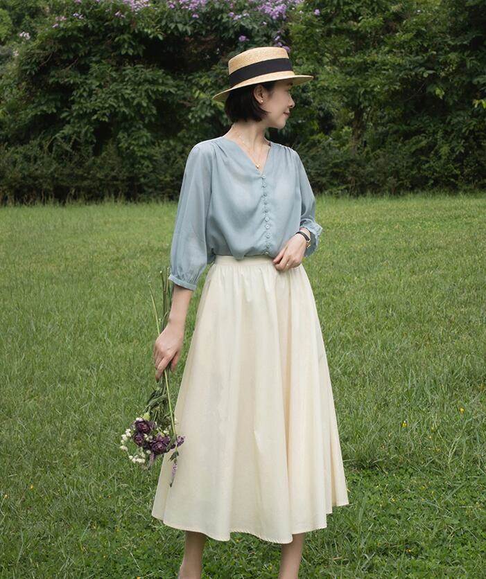 純白色的上衣非常素雅干凈,百搭又耐看,與卡其色的半身裙搭配也能很協調時尚,營造出優雅知性的風格,如果覺得造型過于單調,可以利用一件彩色的針織衫作為披肩,瞬間就時尚了許多,可以更好的凸顯個人品味。