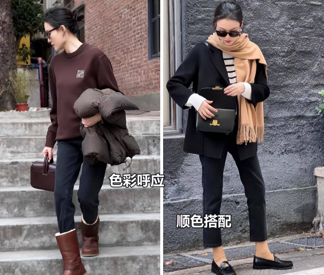 內搭與褲裝構成順色,或是利用圍巾、帽子、包包、鞋子等呼應,這樣可以在顏色上加強造型的連貫性,同時延長縱向線條,打造簡約高級的造型。