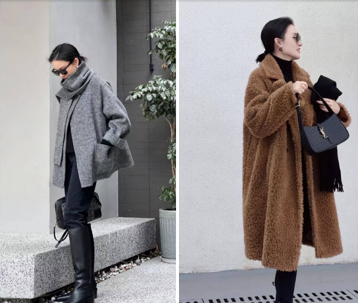 那首先我們在選擇服裝的時候就要注意避開多余設計的款式,選擇簡約、有質感的服裝,例如羊毛、羊絨、仿皮草大衣,或是寬絎縫羽絨服等等。而穿著這些有厚重感的服裝時,內搭要足夠修身,搭配緊身褲、直筒褲或煙管褲等,上寬下窄看上去會更加利落顯瘦。