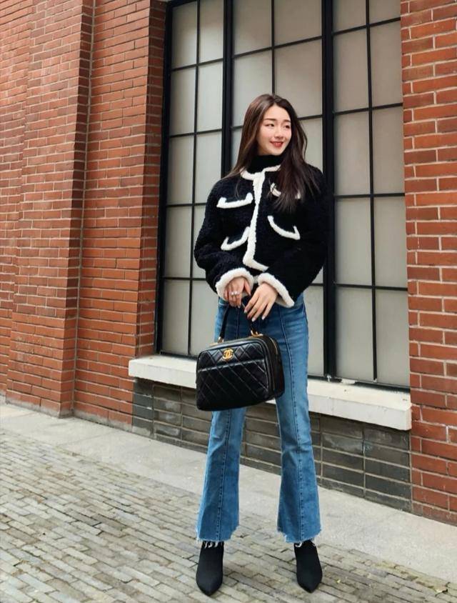 下身的微喇牛仔褲帶著一點復古魅力,和上衣組合成極為的優雅的知性風采,配黑色手提包和靴子,將不同的時髦魅力彰顯出來,凸顯別樣女性魅力。
