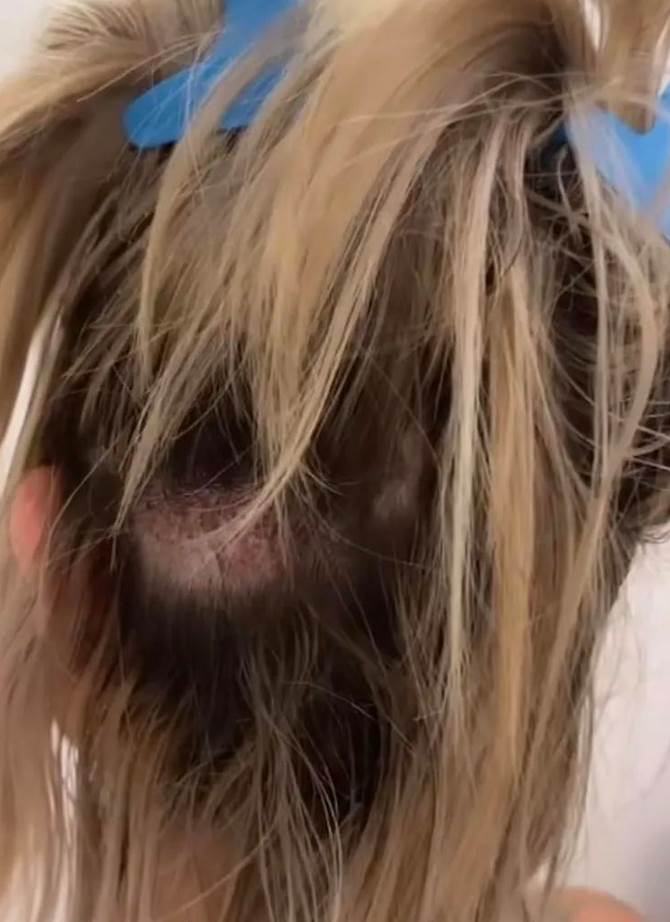 然后剃掉了她后腦勺的一些頭髮,取走一些毛囊,然后再依照畫好的形狀用頭髮毛囊將輪廓填充滿,再把剩下的毛囊加密種植在她原本的眉毛上。