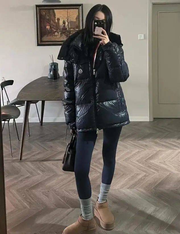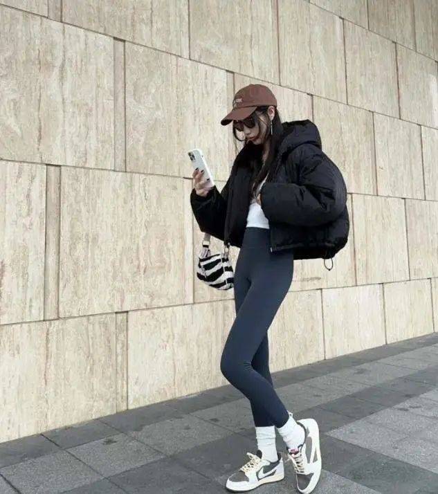 高腰款式瑜伽褲,可以牢牢坐實妳的纖細修長腿型,怕冷的女生,冬天可以大膽搭配廓形的羽絨服,色彩以基礎色作為點綴,就不會顯得過于扎眼,純黑色的瑜伽褲調節腿型和精簡的色彩,完全不會顯腿粗。