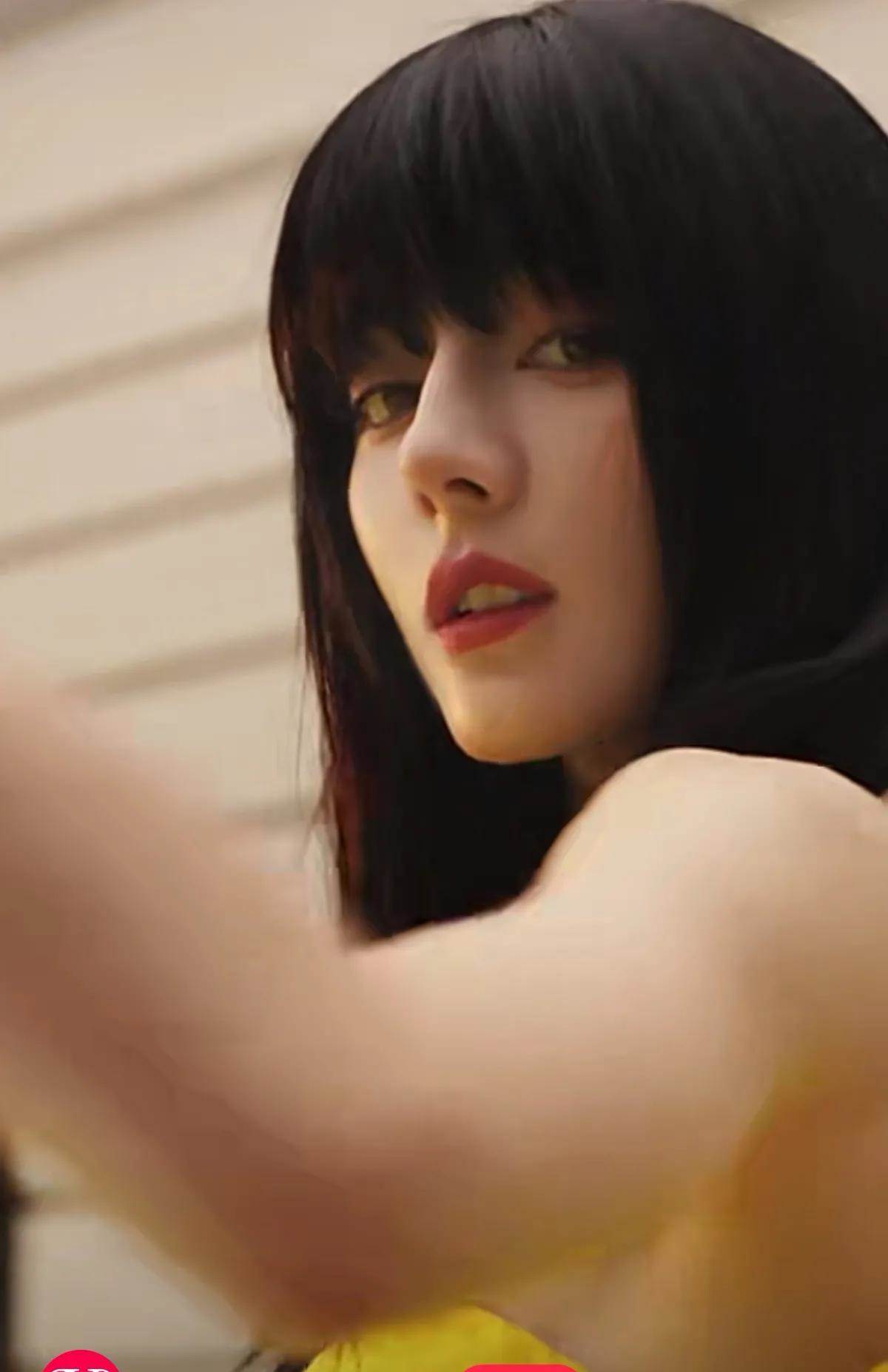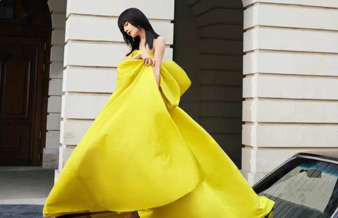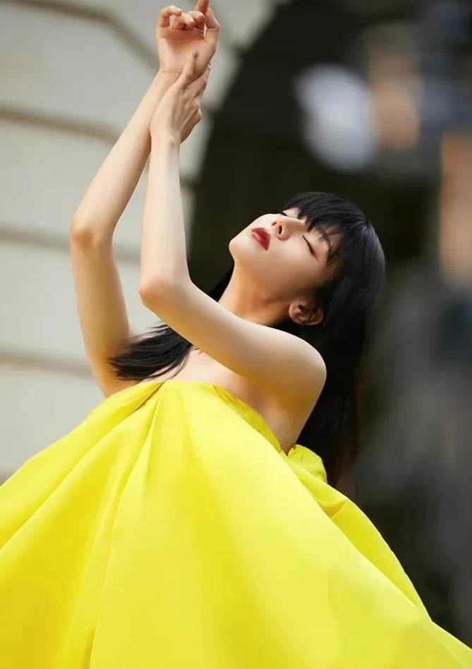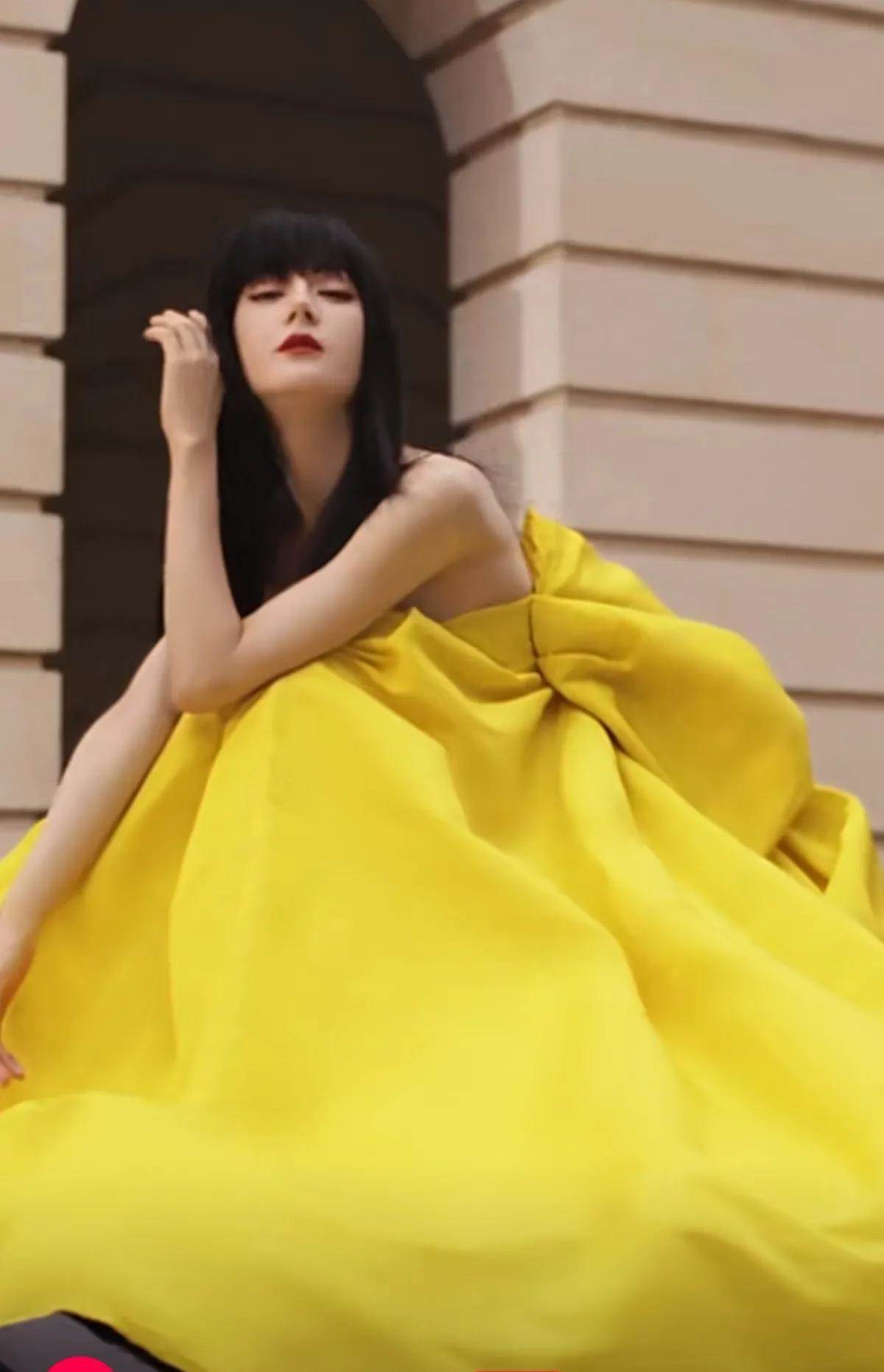 迪麗熱巴代言某奢侈品牌香水,她穿著一件明亮的檸檬黃抹胸長裙,露出纖細的胳膊,一頭黑色長直發,還剪了齊劉海,鮮艷的裙子和冷艷的妝發造型,形成鮮明的對比。