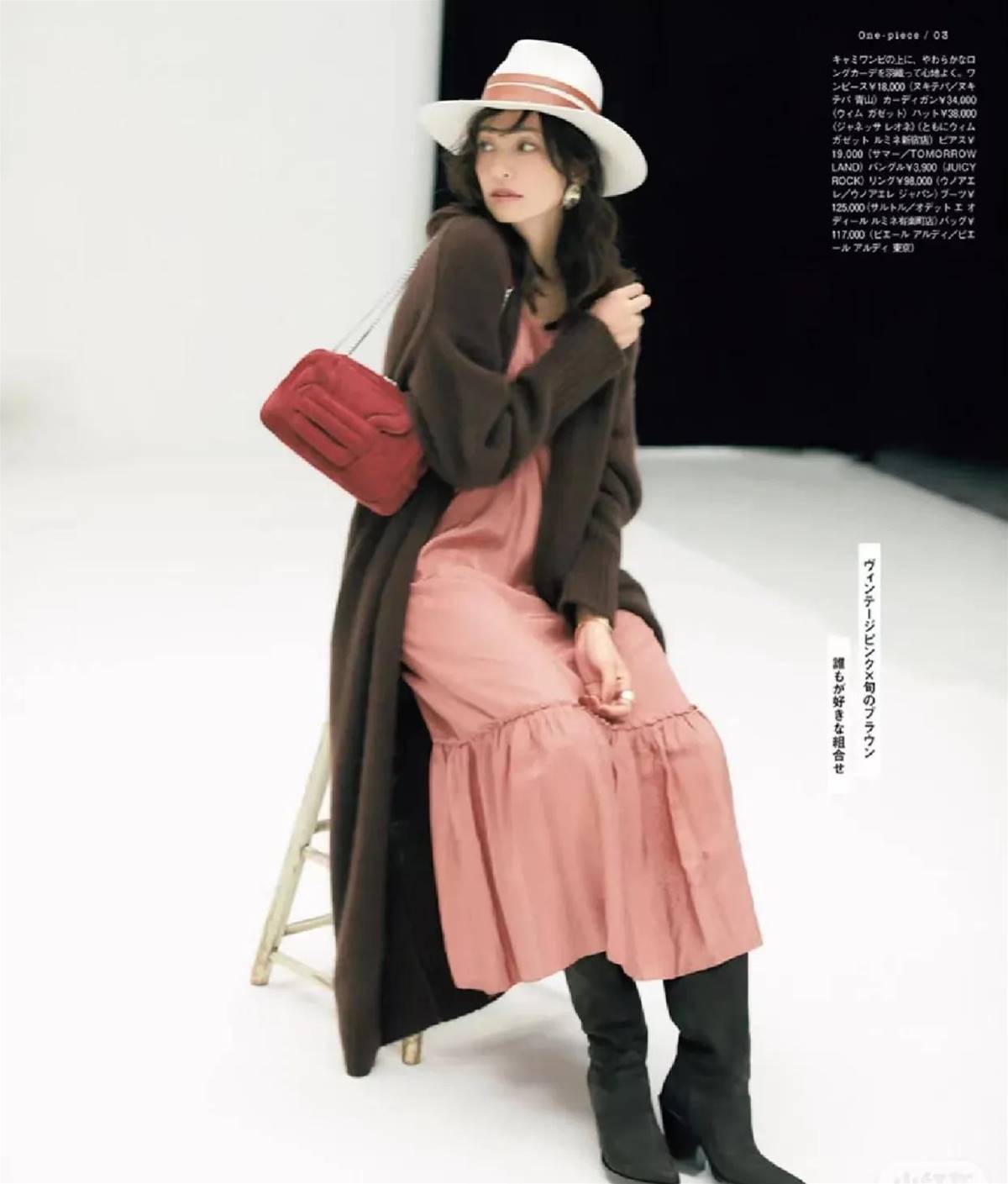 針織開衫總給人帶來一種溫柔感,搭配了咖啡色就顯得更加柔和,配粉色半裙,搭配白色禮帽和紅色包包,多麼優雅精致的一身,在春天這麼穿簡直不要太美。
