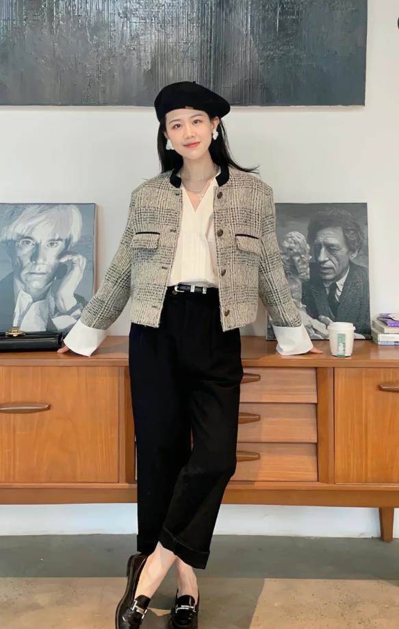 下身闊腿褲的搭配關鍵是整體顯高性和拉伸性的關鍵之處,所選搭配的闊腿褲版型最好是高腰的設計,能夠完美的提升腰肌的水平位置,再搭配自帶低跟或者是尖頭設計的樂福鞋,整體將整個下半身的比例進行拉長和拉伸。